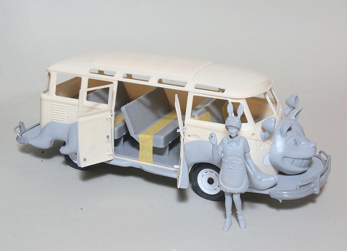 またコスプレした幼稚園教諭(※)のフィギュアも添えます。 ※ つい保育士と書きたくなりますが、こういうキャラクター送迎バスを運用しているのは幼稚園がほとんどでしょう。 |